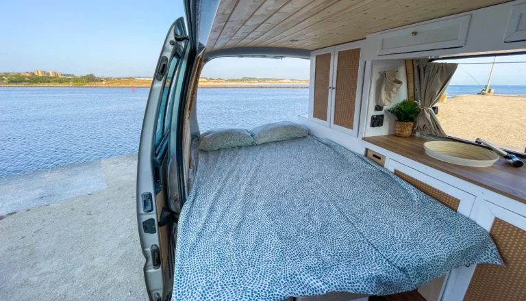 Inside, you’ll find a spacious double bed, a sink, a refrigerator, and a foldable table for dining. Surfboards can be stored on the roof rack or in the large storage space under the bed. Plus, with plenty of cabinets, there’s enough room for all your belongings.